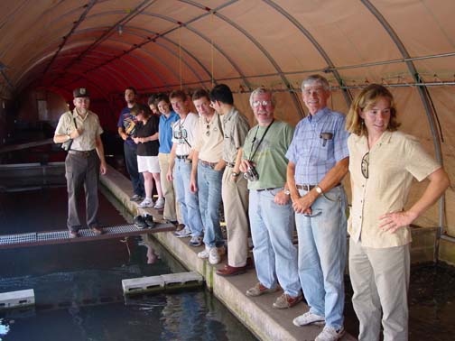 Amy Salveter heads a line of OHWG participants at the Mammoth Spring National Fish Hatchery (Mammoth Spring, AR) following the September 2002 meeting. Photo by Stan Trauth. |